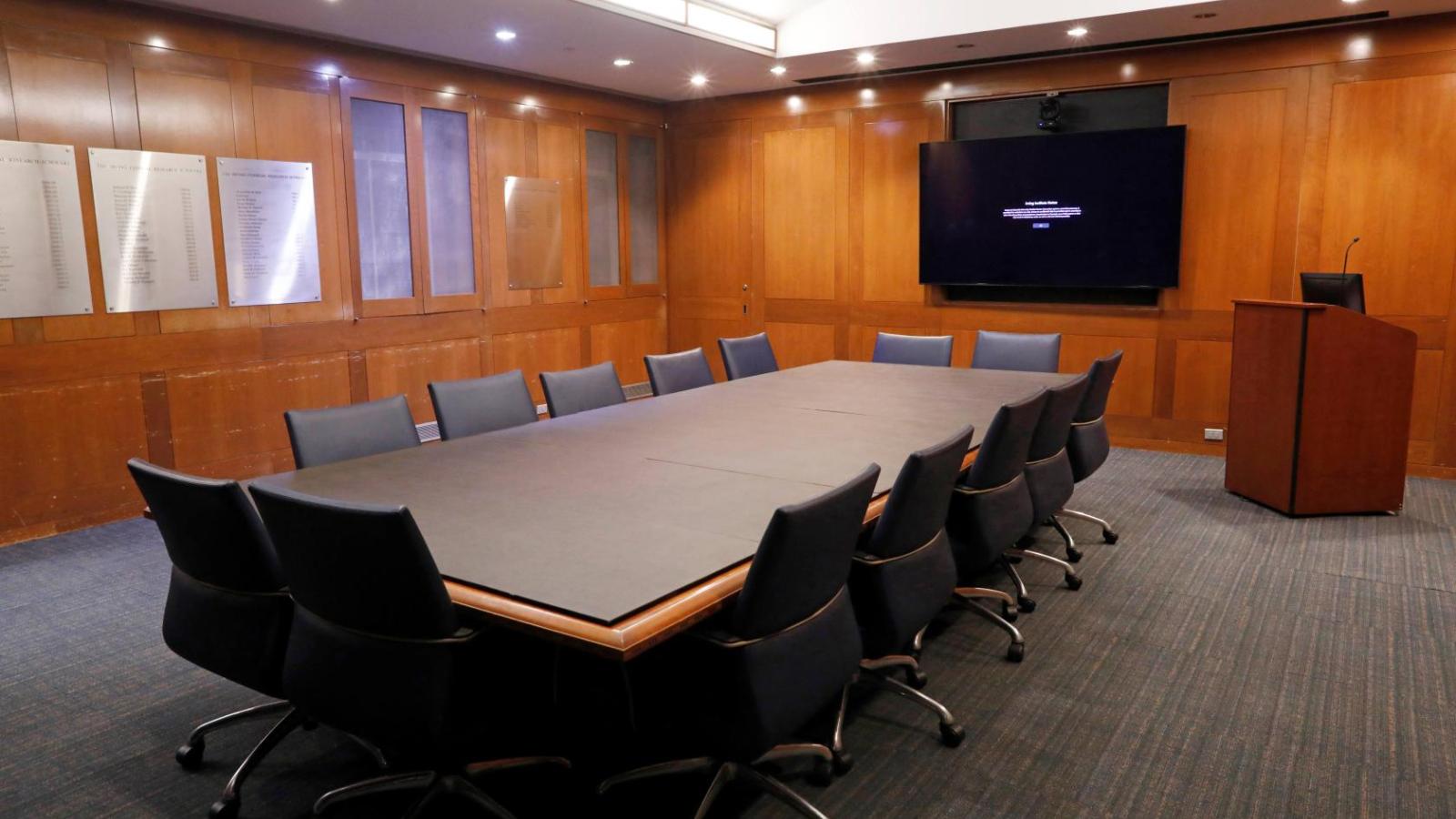 • A/V equipment: Computer at podium with touch screen, VGA and HDMI connections, in-ceiling microphone and speakers, dual cameras in front and rear of room, and two projection screens. Instructions on how to use our system will be provided upon booking. A/V support may also be requested.
