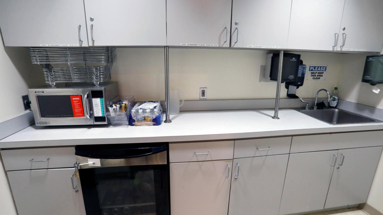 • Kitchenette: This room has a small kitchenette equipped with a hand-washing sink, counterspace, and microwave.